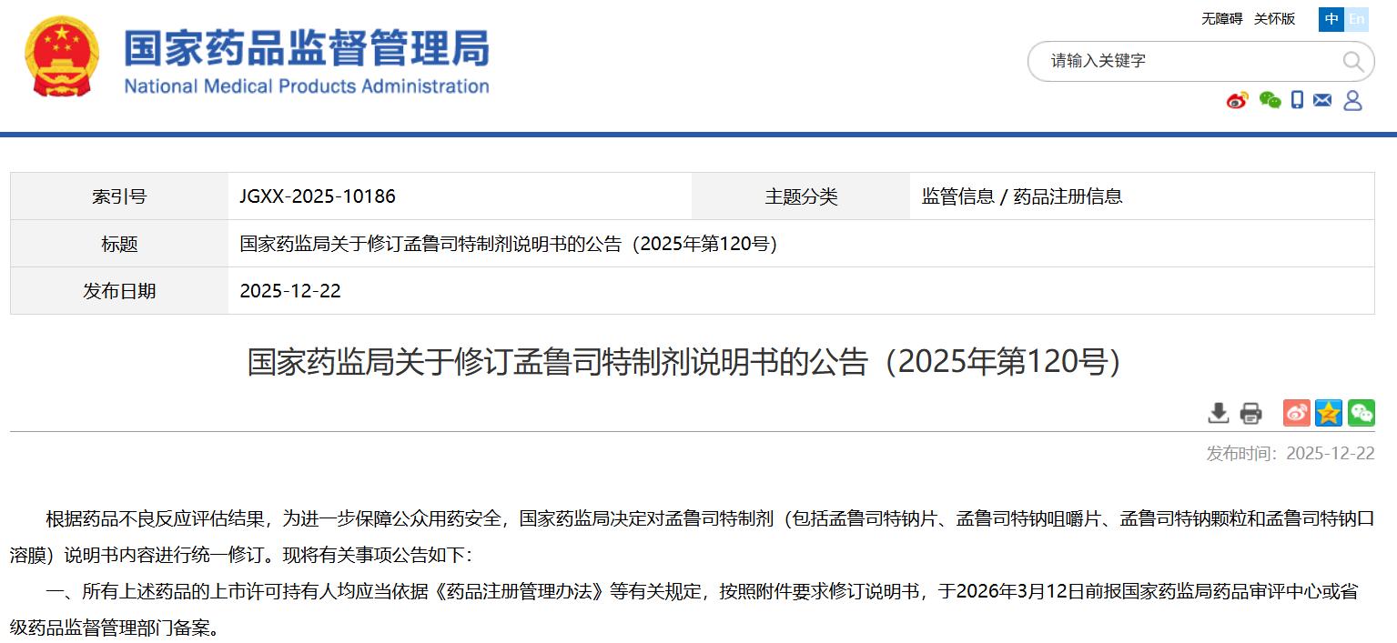 政策法规 ||关于修订孟鲁司特制剂说明书的公告(2025年第120号)(附法规概览12.22-12.26)