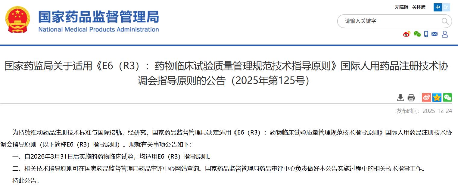 国家药监局关于适用《E6(R3):药物临床试验质量管理规范技术指导原则》国际人用药品注册技术协调会指导原则的公告(2025年第125号)