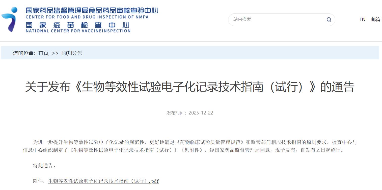 关于发布《生物等效性试验电子化记录技术指南(试行)》的通告