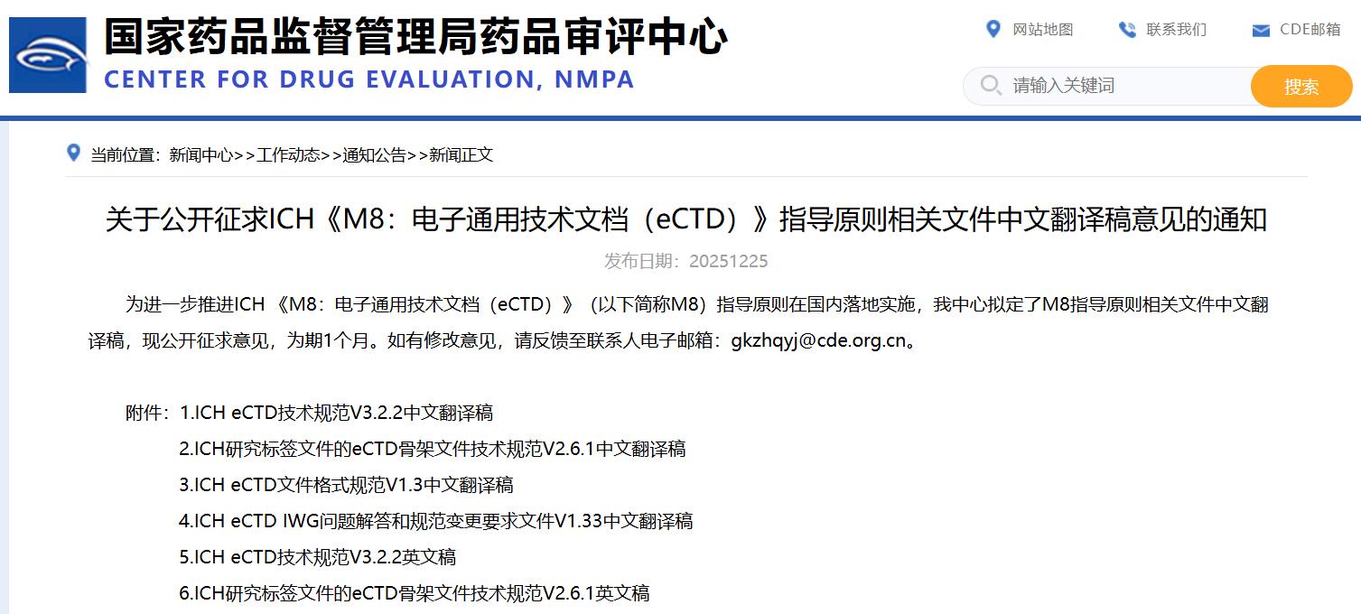 关于公开征求ICH《M8:电子通用技术文档(eCTD)》指导原则相关文件中文翻译稿意见的通知