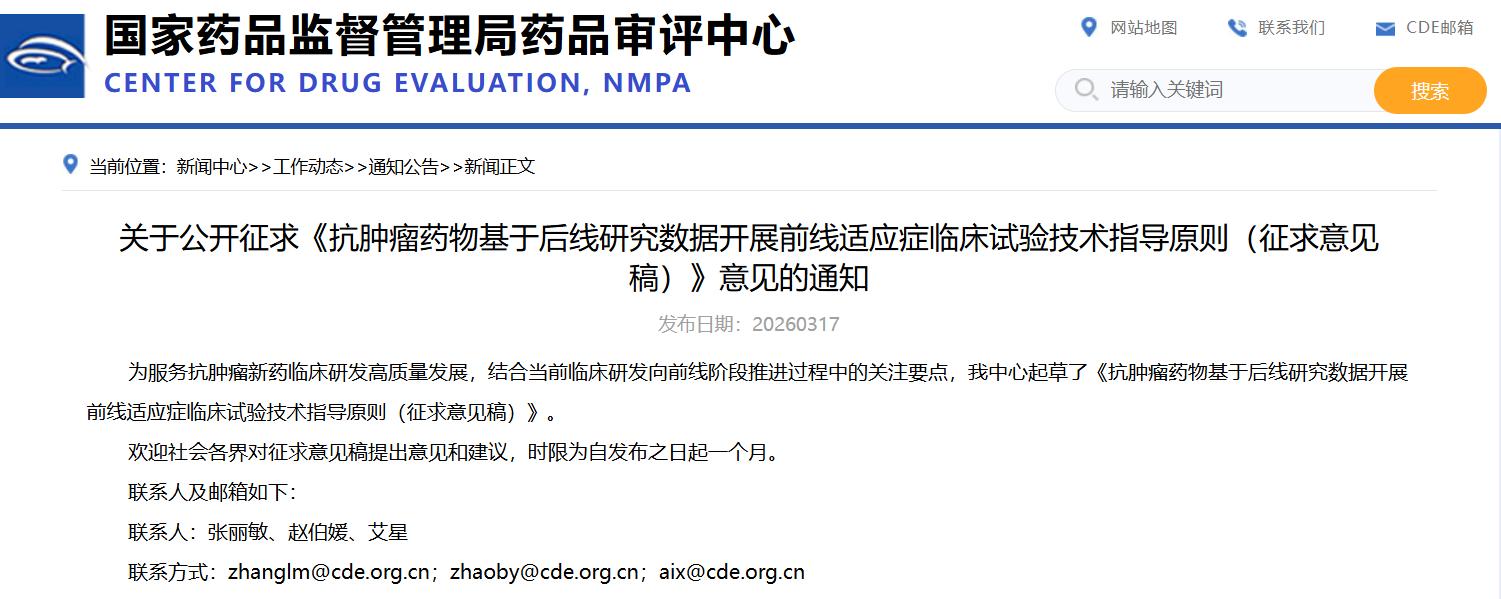 关于公开征求《抗肿瘤药物基于后线研究数据开展前线适应症临床试验技术指导原则(征求意见稿)》意见的通知