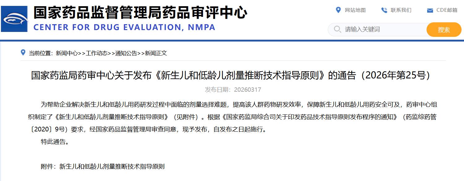 国家药监局药审中心关于发布《新生儿和低龄儿剂量推断技术指导原则》的通告(2026年第25号)