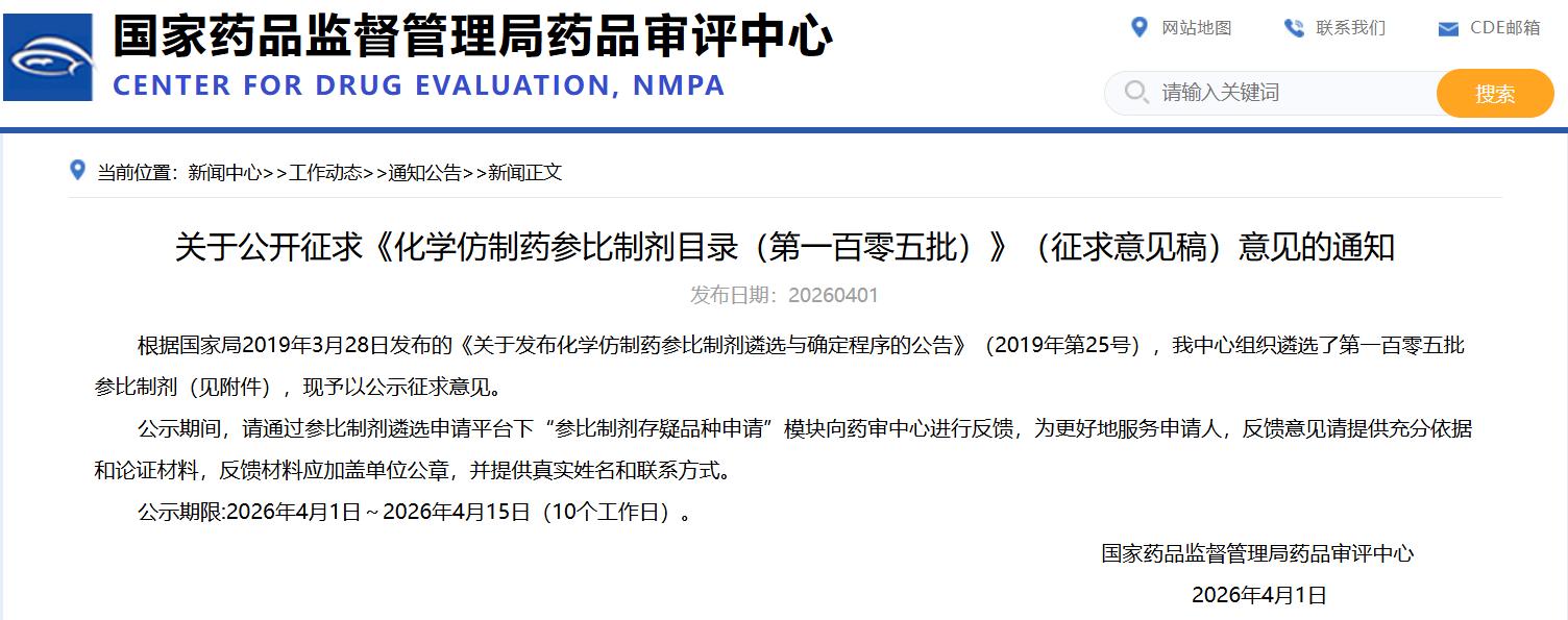 关于公开征求《化学仿制药参比制剂目录(第一百零五批)》(征求意见稿)意见的通知