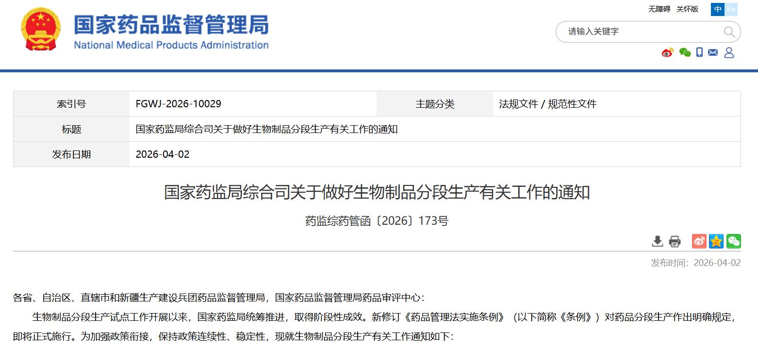 国家药监局综合司关于做好生物制品分段生产有关工作的通知